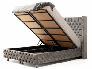Lit coffre relevable avec rangement à l’intérieur.